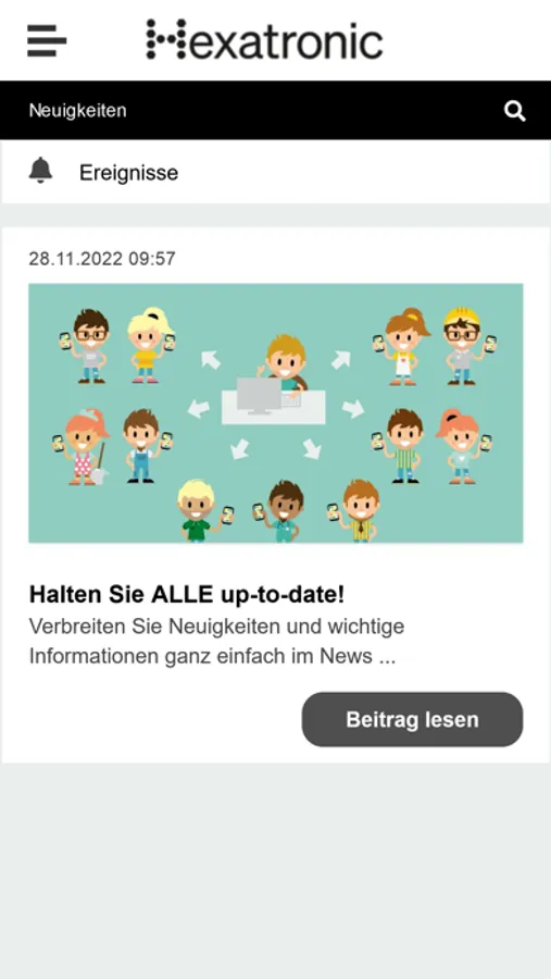 Mittels internem Messenger haben Sie die Möglichkeit, direkt mit Ihren Kolleginnen und Kollegen zu chatten und persönliche Erlebnisse oder Ideen auf die virtuelle Pinnwand zu posten. Die Hexatronic Mitarbeiter-App ähnelt dem Aussehen einer gewohnten Social Media Umgebung und ist daher überaus einfach zu bedienen.