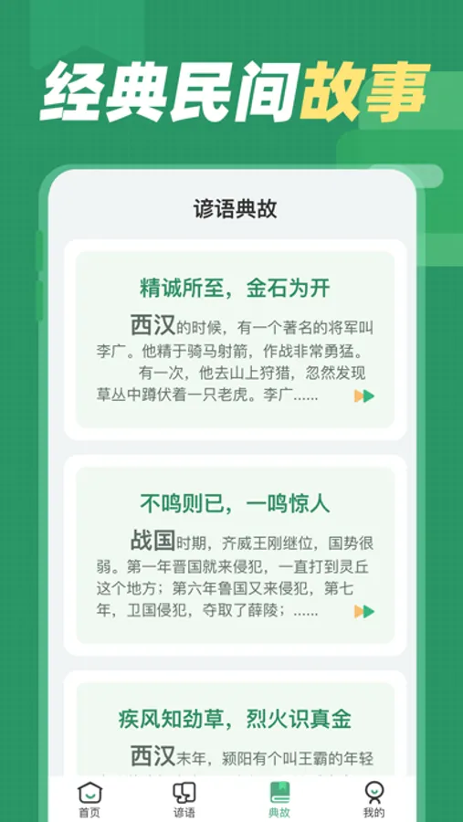 3.谚语大全每天会给用户推荐几条精选谚语,并设置了收藏功能;每日打卡可以让用户养成每天学谚语的习惯;谚语挑战是通过趣味的玩法更好的学习掌握谚语;还包含了谚语故事,带你了解谚语背后的故事。