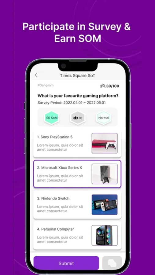 - Survey participants will be rewarded with SoM after completing the survey. SoM can be used to upgrade your avatar or purchase various items & services from the Marketplace.