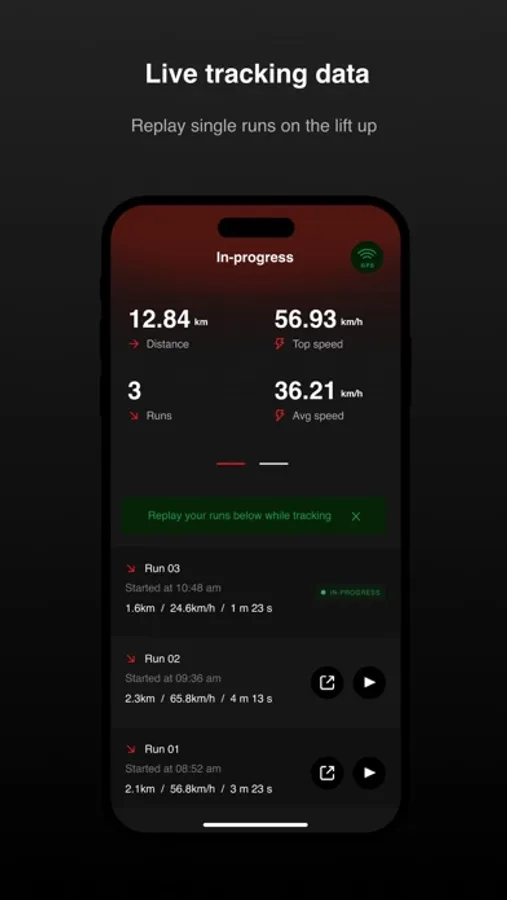 Replay your single downhill runs in 3D while you ride the gondola up, and share your single runs from the live tracking screen without stopping your tracking.