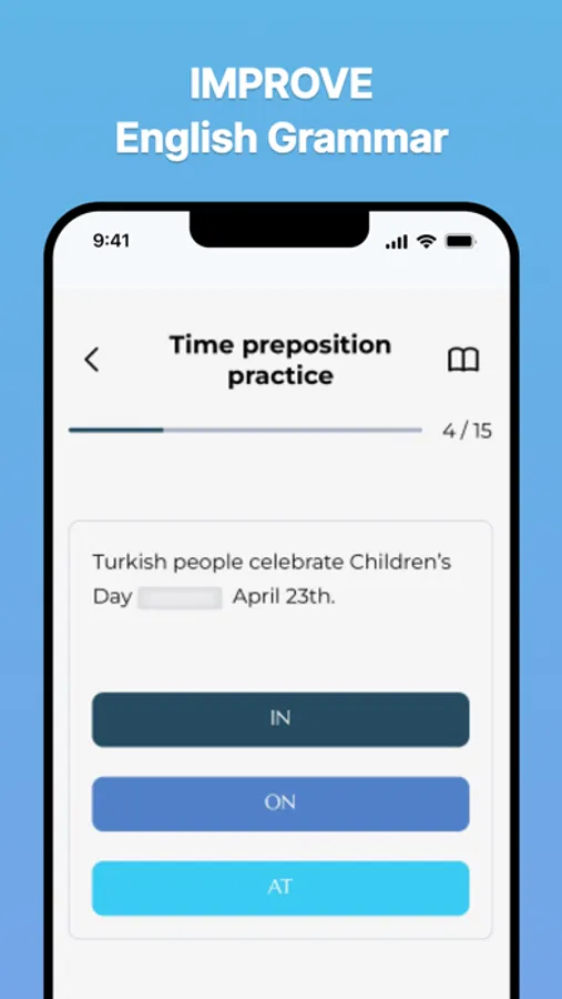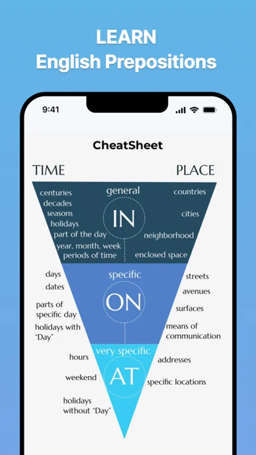 With the help of our application with the exercises you will learn the rules for using English prepositions in, on, at and learn the types of prepositions, examples and exceptions. Simple and accessible, without complex terms, so that beginners can learn English or people who do not remember the basics of English well can understand it and put it into practice.