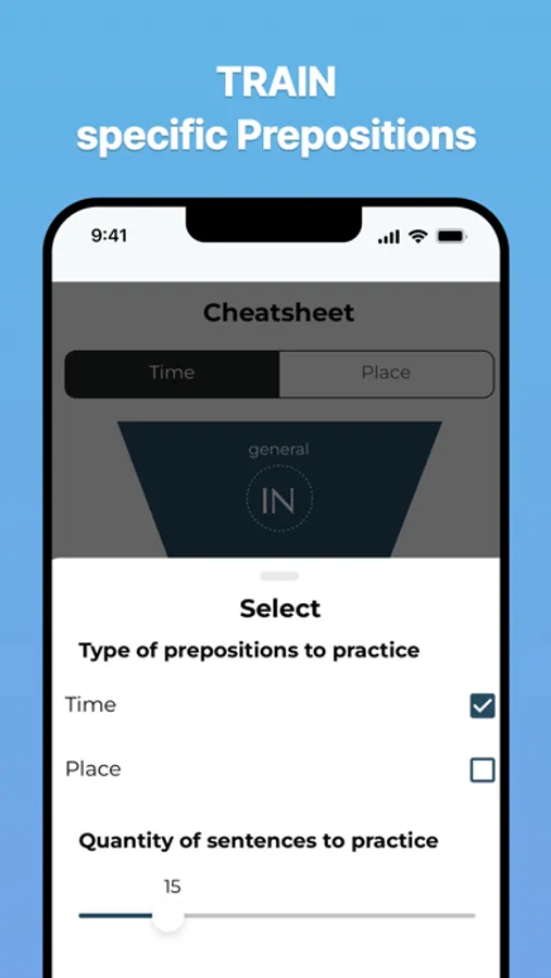 Choose how many sentences for studying English grammar prepositions will be in the exercise (from 1 to 50).