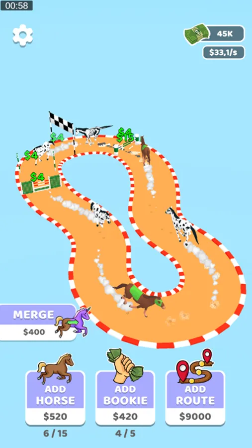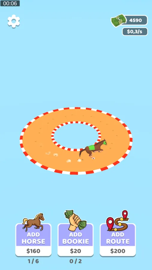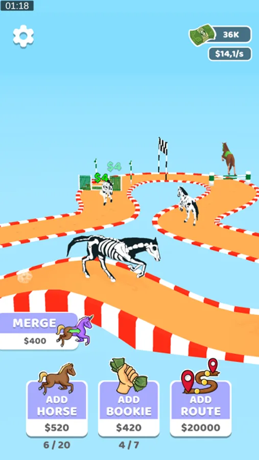 Collect money as your horse goes round. Each obstacle or challenge a horse hits will net you some bank. Grow your team and add more features to raise your income.