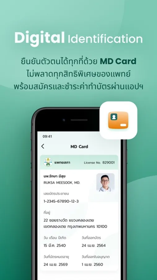 • ไม่พลาดทุกสิทธิพิเศษ ด้วย Digital MD Card เสมือนพกบัตร MD Card สามารถใช้ยืนยันตัวตนความเป็นแพทย์แพทย์ผ่านแอปพลิเคชันได้ทุกที่ ทั้งใน และ ต่างประเทศ