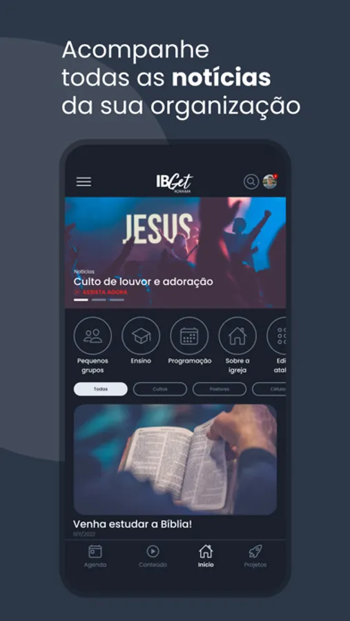 Recursos disponíveis no Aplicativo: Notícias, Agenda da igreja, Eventos, Conteúdos, Projetos, Transmissão ao Vivo e Módulo Ensino.