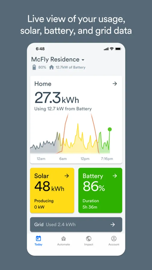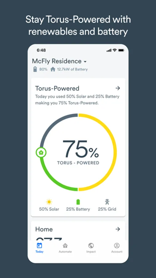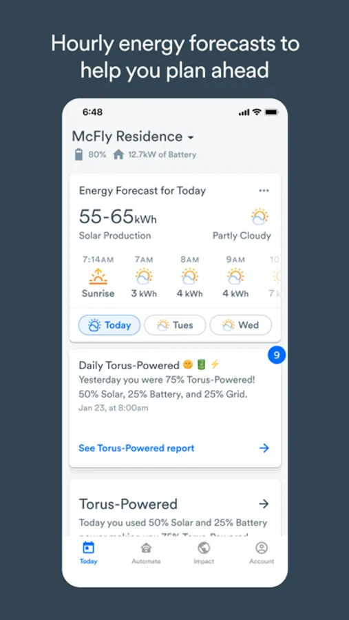 The Today experience surfaces important insights and recommended actions to help you get the most out of your Torus Station on a daily basis. See how much renewable and battery power you’re using with Torus-Powered, plan your usage with personalized Energy Forecast, and monitor your home’s power in real-time.