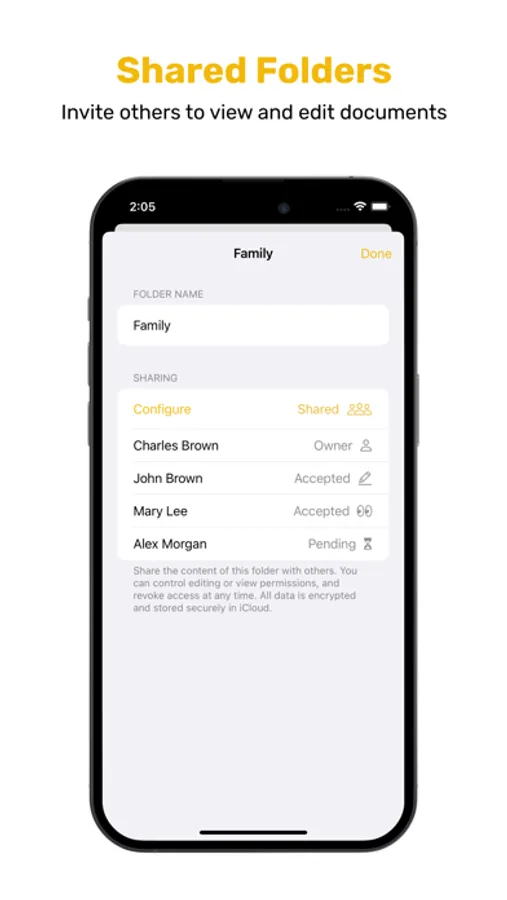 Finale Passport never collects your data, nor has access to your information. Everything is encrypted and is stored safely on your device. If you enable iCloud syncing, your data is additionally uploaded to your personal iCloud container in the same way as standard iOS apps like Photos, Notes, Reminders, and others, using the same high-grade Apple's encryption.