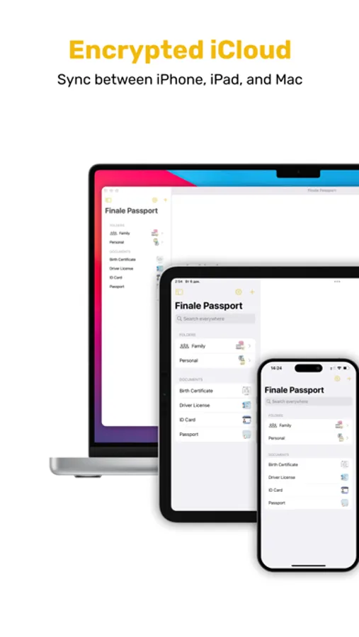 Finale Passport stores data locally on device, but is also able to sync everything to iCloud with Apple's secure encryption. Finale Passport has apps are available for iPhone, iPad, and Mac with instant sync, ensuring you have access to your documents anywhere you go.