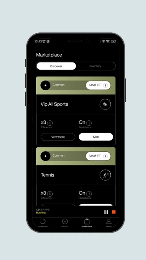 The inSHAPE App allow users to mint, upgrade and merge NFTs for each sport activity, that will allow users to get more SHAPE tokens.