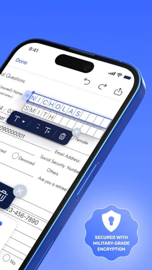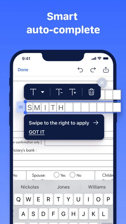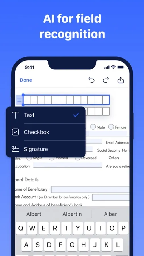 2. Tap on any field and start typing. The font size, text positioning, checkboxes and signature fields will be accurately detected with AI technology.