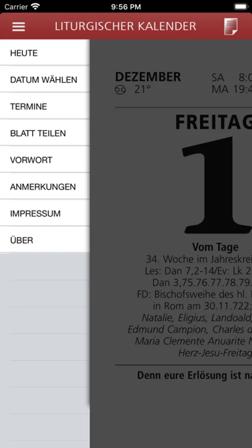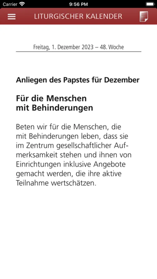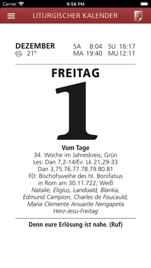 - die kirchlichen Feste (Hochfeste, Feste, gebotene und nicht gebotene Gedenktage, Kirchen- und Diözesanfeste und Namenstage) sind ihrem Schriftgrad entsprechend hervorgehoben. Bei den Sonntagen und gebotenen Feiertagen erscheinen Datum und Name in Rot. Andere kirchliche Hochfeste, die nicht gebotene Feiertage sind, werden durch Rot ihres Namens, höhere Feste in Fettschrift und größerem Schriftgrad gekennzeichnet,