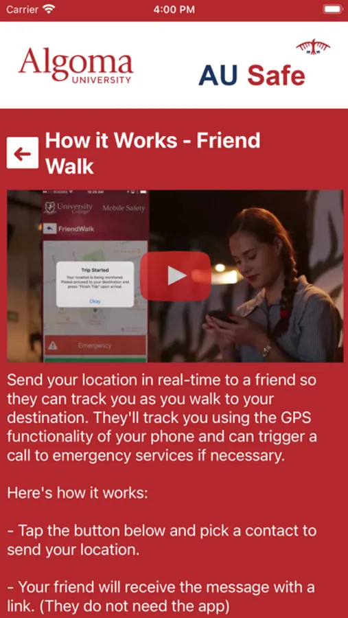- Safety Notifications: Receive instant notifications and instructions from Algoma University safety when on-campus emergencies occur.