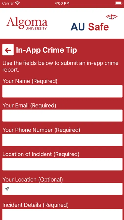 - Tip Reporting: Multiple ways to report a safety/security concern directly to Algoma University security.