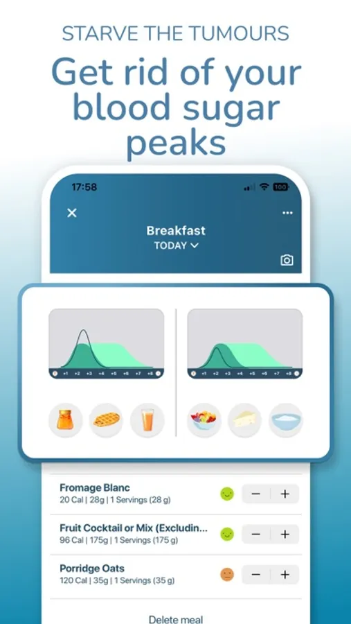 ● 3. Carbohydrates are essential for your metabolism, but it is important to be careful and avoid high glycemic peaks after meals to reduce the availability of glucose that cancer cells use as their food source. You will discover before each meal, whether the glycemic peak that will be triggered will be high or not, and DietSensor will also allow you to adjust this meal with the right foods combinations in a few clicks, while allowing you to consume a non-restricted diet.