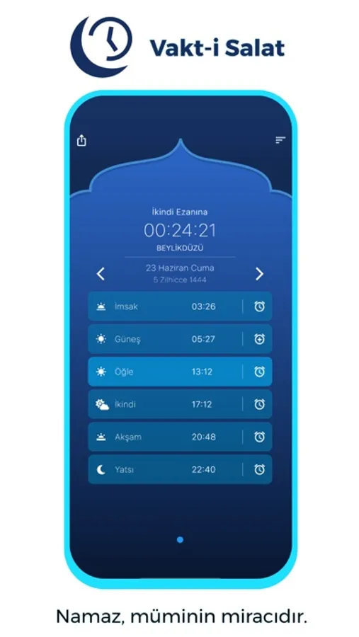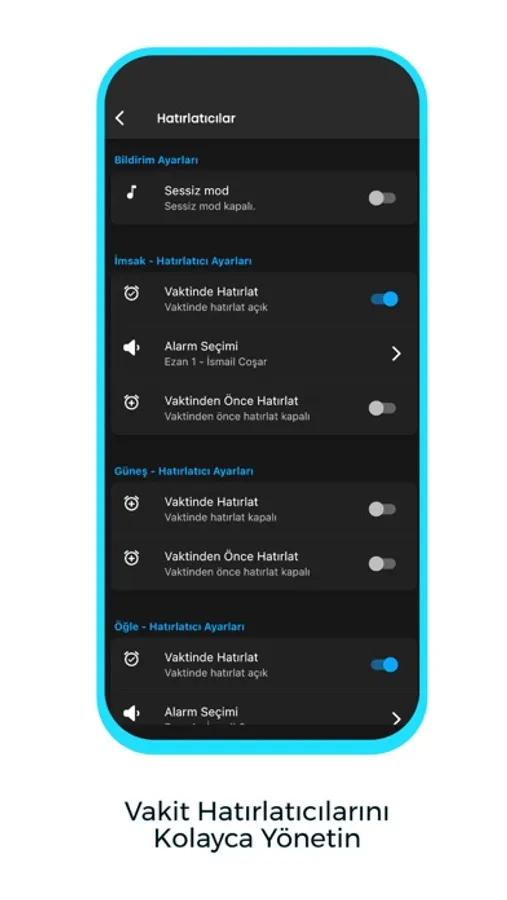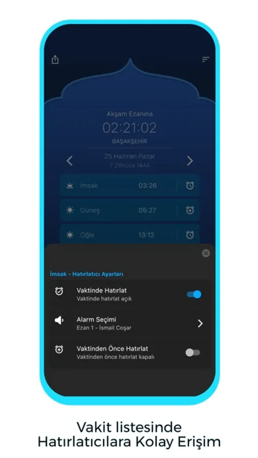 Her vakit için ayrı alarm seçimi ve vaktinden önce hatırlat özelliği ile hatırlatma seçeneklerini dilediğiniz gibi özelleştirebilirsiniz.
