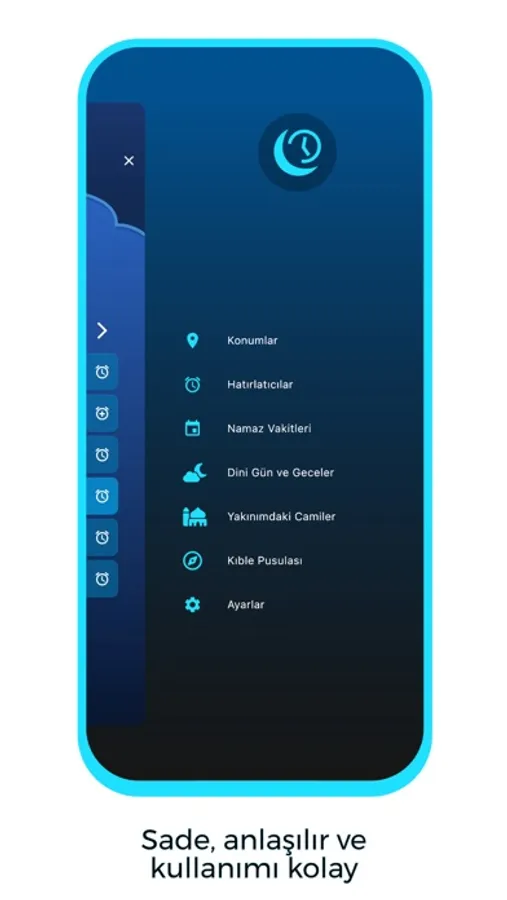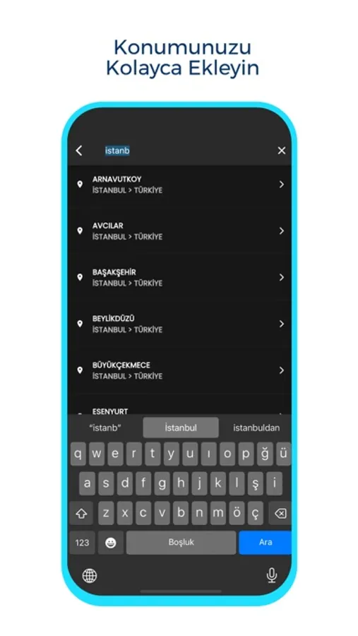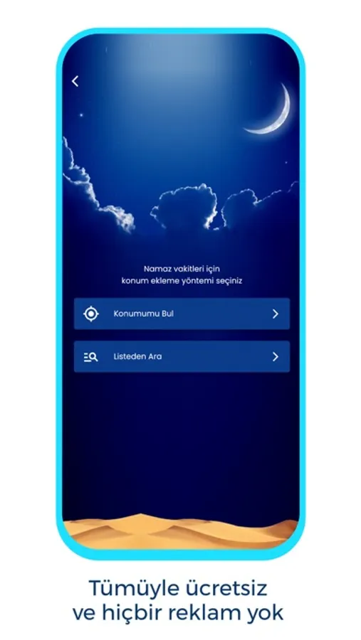 Konum izni ile namaz vakitleri bir dokunuşla hazır. İsterseniz listeden seçerek de konum ekleyebilirsiniz. Birden çok konum ekleyebilir ve konumlar arasında hızlıca geçiş yapabilirsiniz.