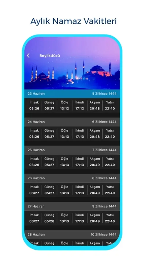 Aylık namaz vakitleri tablosu ile 1 aylık namaz vakitlerini, listenizdeki tüm konumlar için kolayca görüntüleyebilrsiniz.
