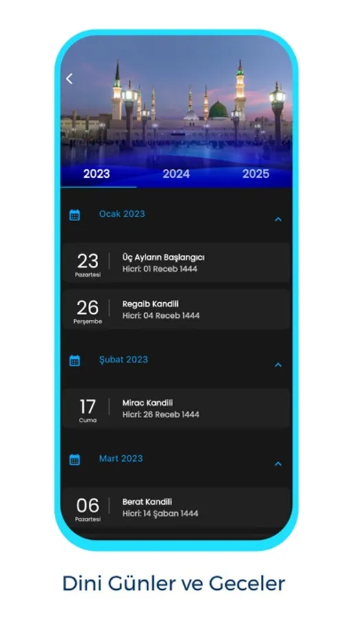 Dini Günler ve Geceler listesinde her yıla ait takvim içeriğini görebilir, Ramazan ve Kurban Bayramı namaz vakitlerini rahatça görebilirsiniz.