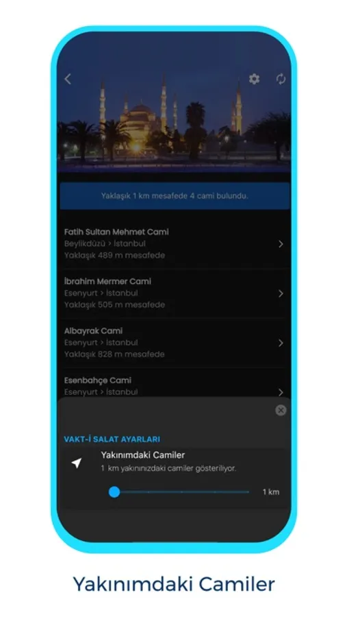 Yakınımdaki Camiler özelliği ile, sizin belirleyeceğiniz mesafe ayarına göre, konumunuza yakın camileri listeyebilir ve harita üzerinde görüntüleyebilirsiniz.