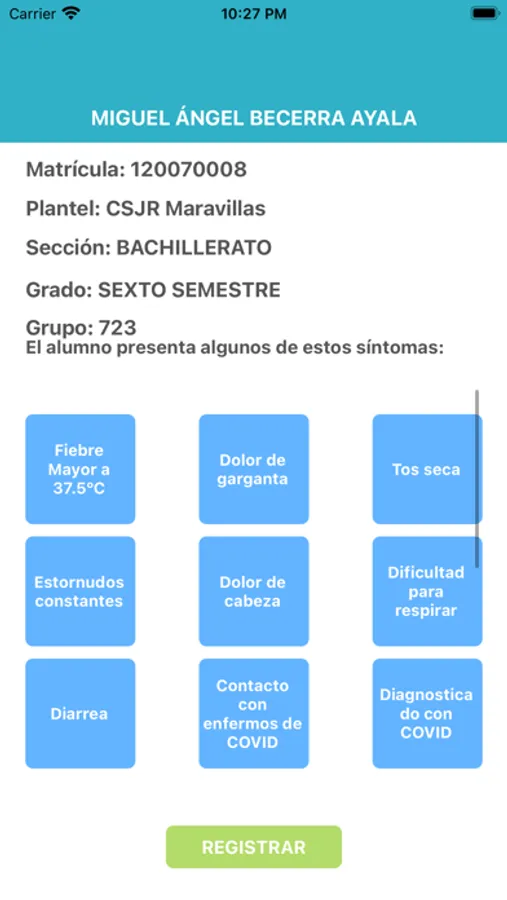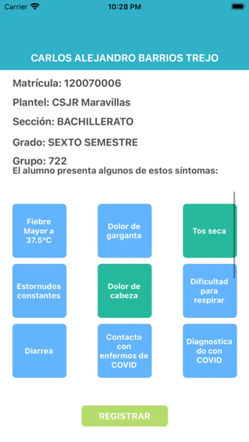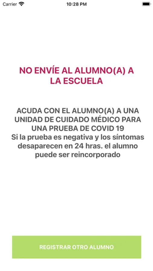 El encargado podrá revisar los síntomas reportados por el alumno y registrar cualquier cambio en los mismos desde que se hizo el chequeo inicial, después procederá a dejar entrar al alumno al recinto o mandarlo a casa. Una advertencia se mostrará en la pantalla de la aplicación cuando los síntomas coinciden con los reportes de posible infección por COVID 19.