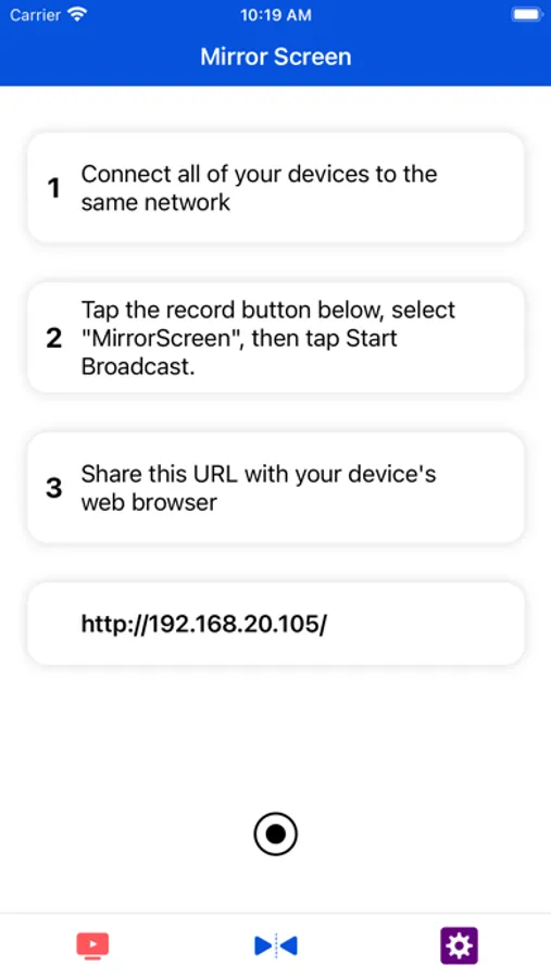 2. Open the app, tap the "Screen Mirroring" button, tap "Start Broadcast", and then tap anywhere to quit this screen.