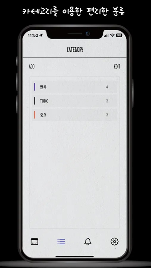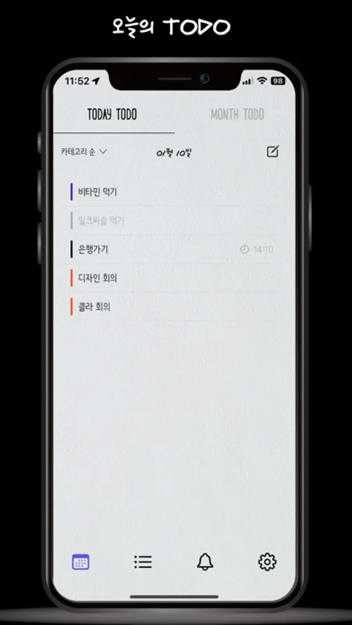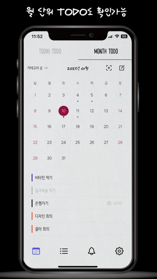 - 하루, 월 단위 또는 카테고리 별로 할 일을 확인
