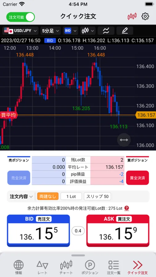 単一、IFD、OCO、IFO、ストリーミング、全決済注文などPC環境と同等の注文が可能です。
