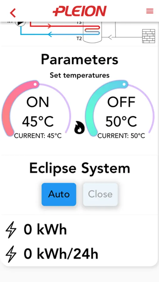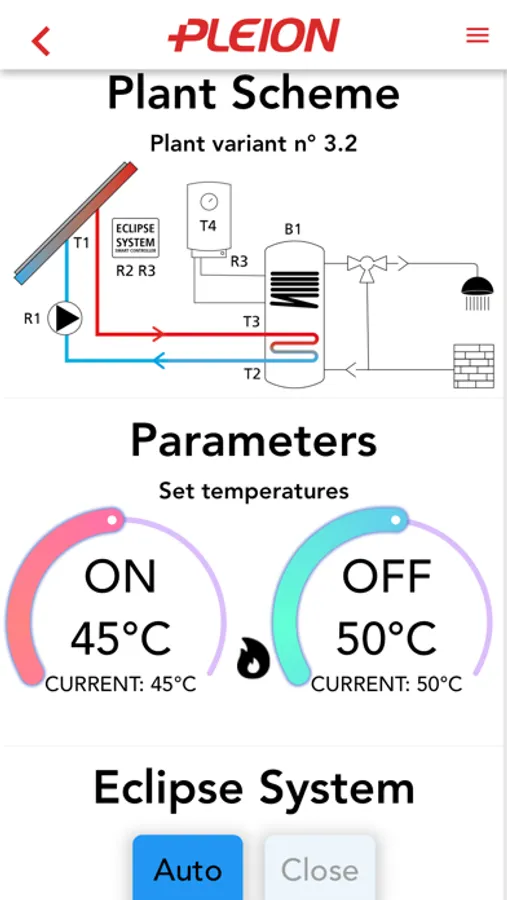 The application allows remote monitoring of the new Pleion PB404-WiFi solar controller. Using the wireless connection of your building, you can connect the PB40-WiFi to the internet and access information from the app such as: temperatures, output status, graphs, system layout and energy produced. Through a simple and intuitive interface, it is possible to monitor the system and set the temperatures of the boiler(*) and the closure of the panel(*).