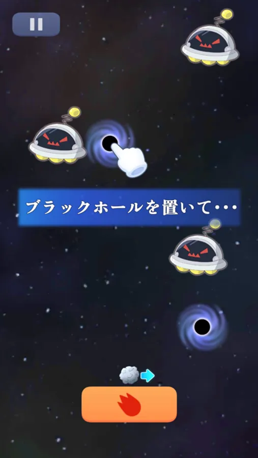 操作はブラックホールを置いて、隕石を発射するだけ!シンプルなパズルゲームを楽しめます。