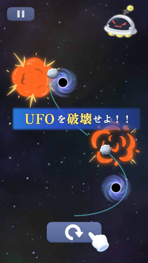 【ブラックホールで導いて!】はリアルタイム物理エンジンを使用した、ブラックホールの重力で隕石を誘導して敵のUFOを倒すパズルゲームです。重力の特性を駆使して、ステージクリアを目指そう!