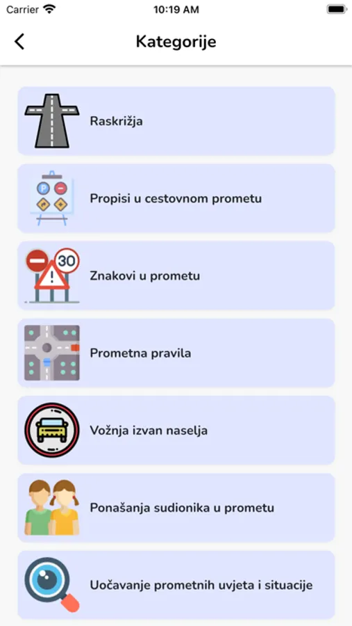 Aplikacija sadrži preko 1000 pitanja uz koje će učenje prometnih propisa biti lakše nego ikad. Uz mnoštvo pitanja podijeljenih u 14 kategorija dodali smo i skriptu za učenje prve pomoći.