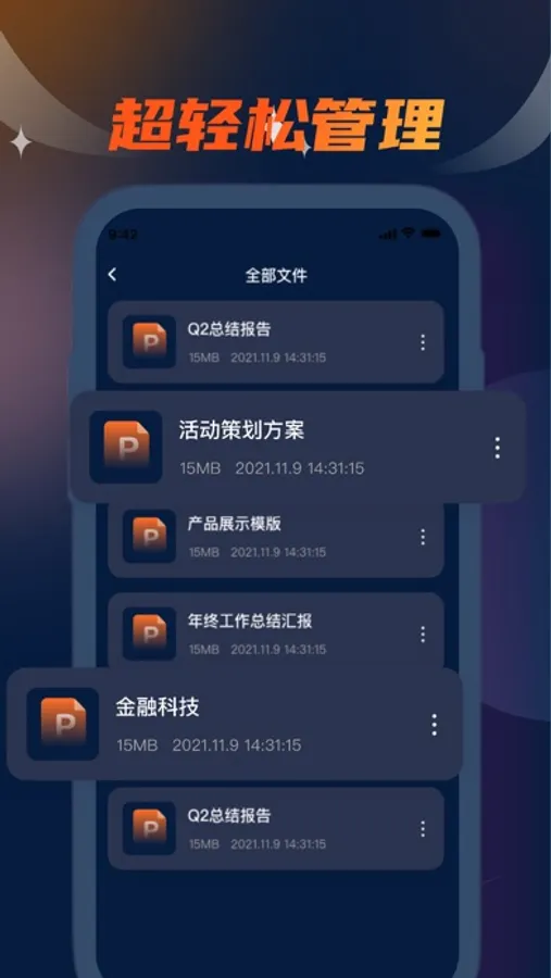 用手机即可随时随地办公,阅览、编辑PPT、文档和表格,方便地管理文件,还有文本翻译功能。
