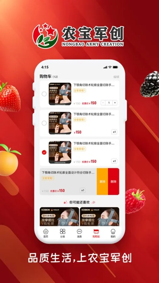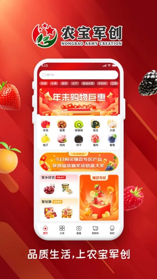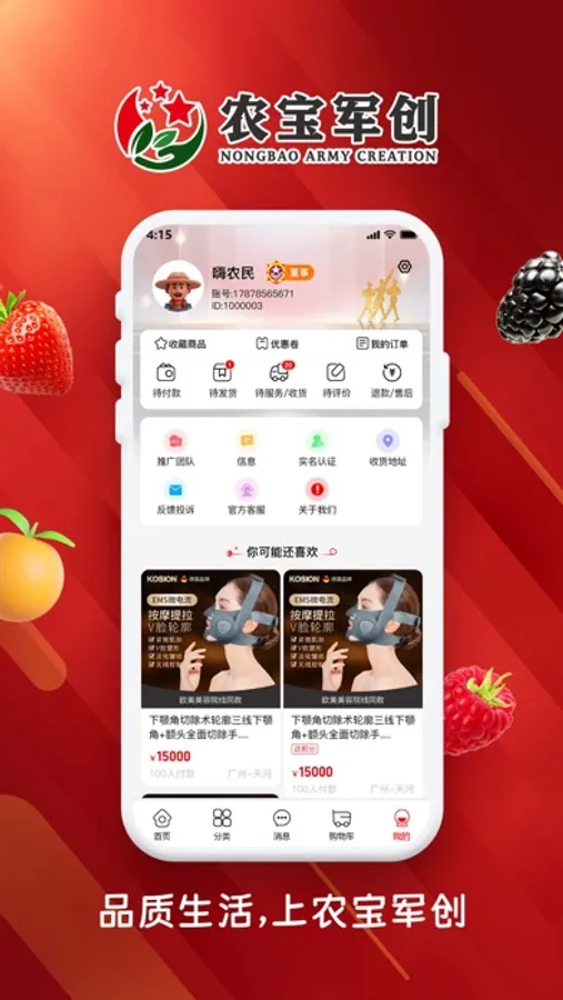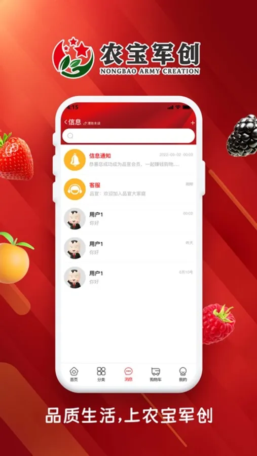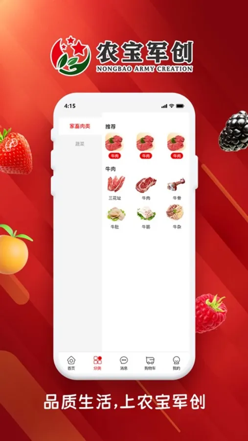 农宝军创App,是一款以农产品为主的线上商城,一键下单,各类特色活动,商城钱包的平台。商城内包括各种绿色农产品,以农民和退役军人为主导的创业服务对象,搭建了退役军人、军属的就业创业平台,为军创企业赋能助力。