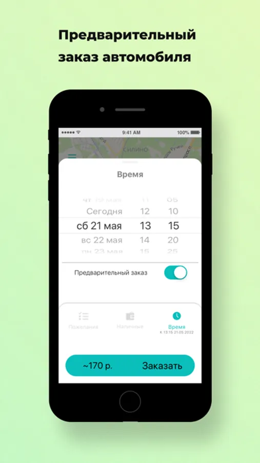 Выберите опцию “Предварительный заказ”. Поиск автомобиля начнется незадолго до заказа поездки, и автомобиль приедет к назначенному времени. Также вы будете заранее знать стоимость поездки.