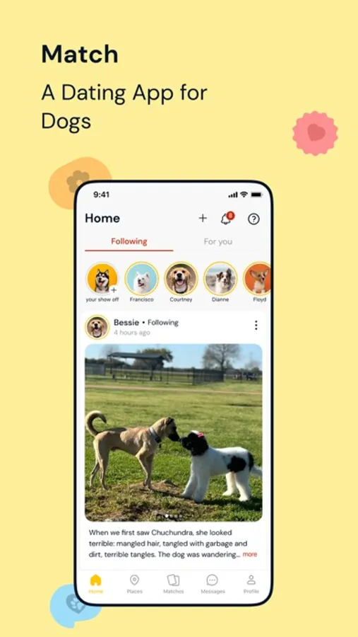 A dating app for dogs to find their lover, best friend, playmate or a buddy. Your dog can live a for filling life when your at work or out of town they never have to be alone again. Unlike other apps the dogs face is the main profile picture, humans play the back round role. This app focuses on finding compatibility between each dog by matching their interest such as, favorite toys, snacks, places to hang out, breed/nationality, gender, size, energy level, and more. A Swipe feature is added to conveniently show interest in each dog. Pup can Exchange pictures, videos, messages and meet up on the site before meeting in person. * Find all locations that accept dogs *Medical articles *star of the week (the most popular posts)