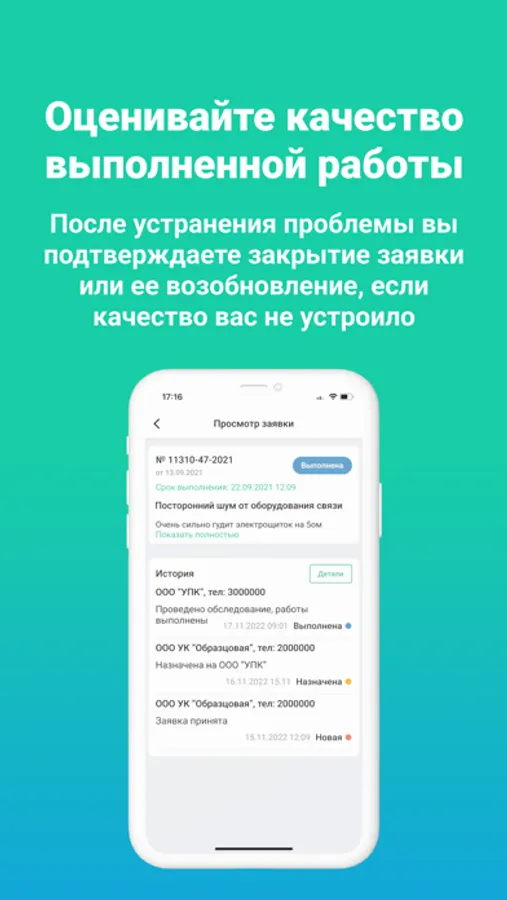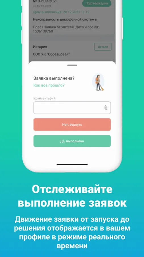 Ваша заявка поступает напрямую вашей управляющей компании. Вы отслеживаете ход заявки и статус ее выполнения в режиме реального времени. Заявка может быть закрыта, только если качество выполненных работ вас полностью удовлетворяет.