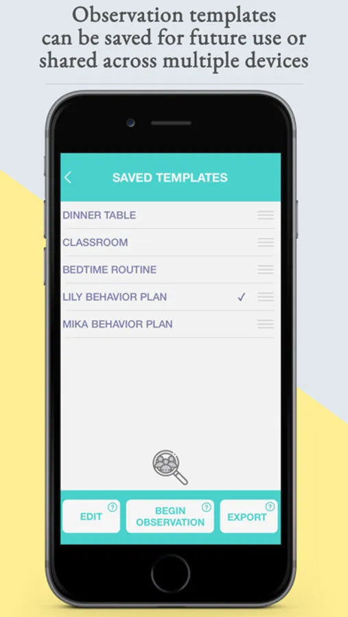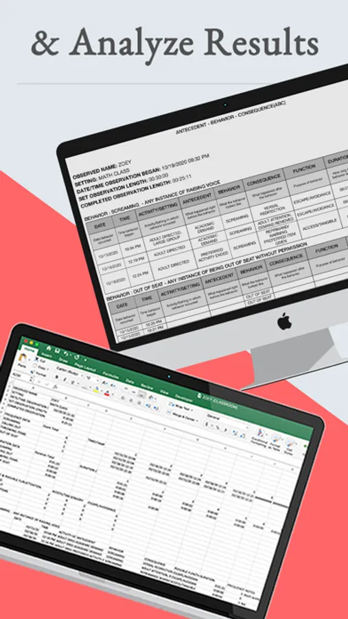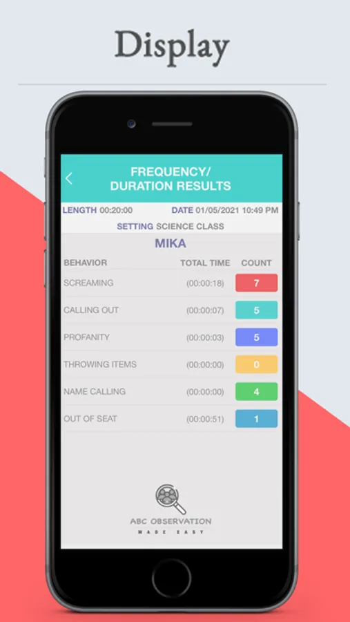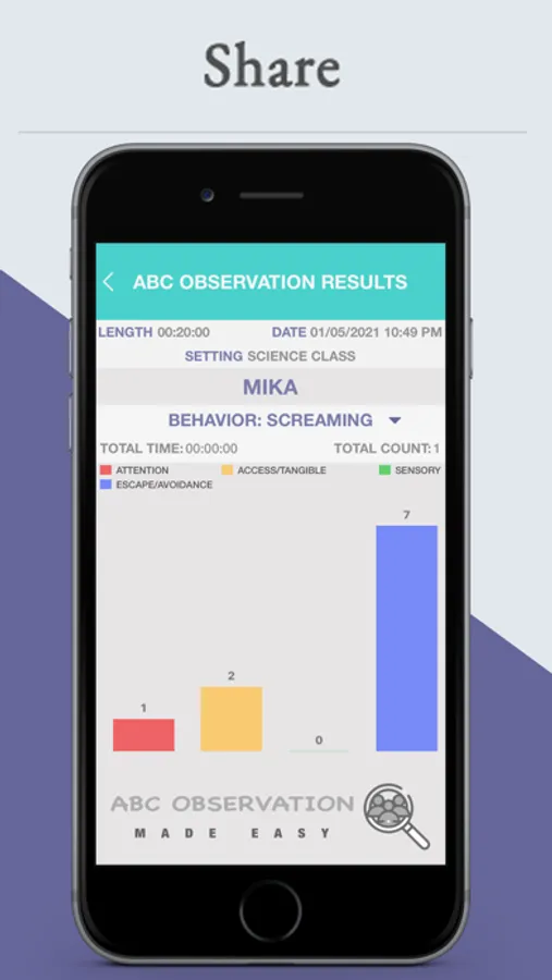 Users can examine many dimensions of a behavior by simultaneously collecting frequency, duration, and ABC data over a single observation session or over multiple days. Results can be exported as raw data through a CSV file, as a frequency & duration chart, ABC bar graph, and/or as a completed ABC chart. Observation templates can be saved for future use and shared across multiple devices.