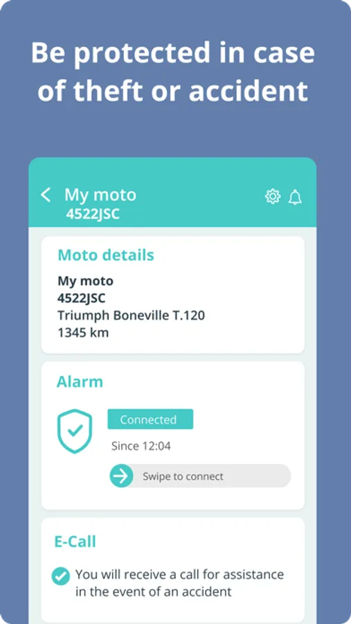* Safety agains accidents * Our system detects a possible impact on your vehicles and send a communication, both to you and to the emergency contacts you have configured. In addition, we generate an accident report that can help you in the event of a claim.