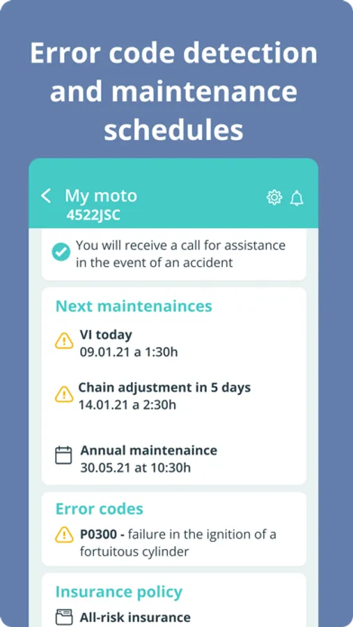 * The maintenance of all your vehicles in the same point * Maintenances, VIs, faults... Manage absolutely all maintenance from the app. In addition, with our error code detection system (DTCs), we will notify you if a potential fault is detected before it occurs.