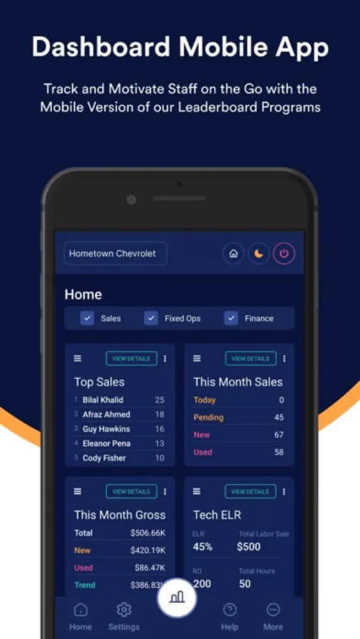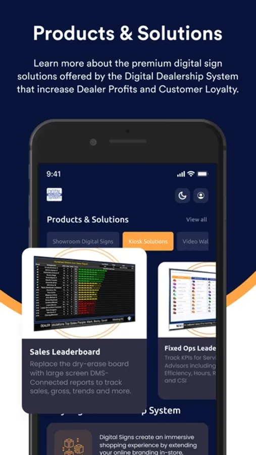 The Digital Dealership System Digital Dashboard puts key dealership metrics in the palm of your hand to track store KPI's, track and motivate staff. The mobile dashboard extends the desktop and screen versions of the system for dealers on the go, so they can spend more time running their business and less time running reports. The system provides quick snap cards to show KPI's of each department while providing a resource of information about the dealership performance.