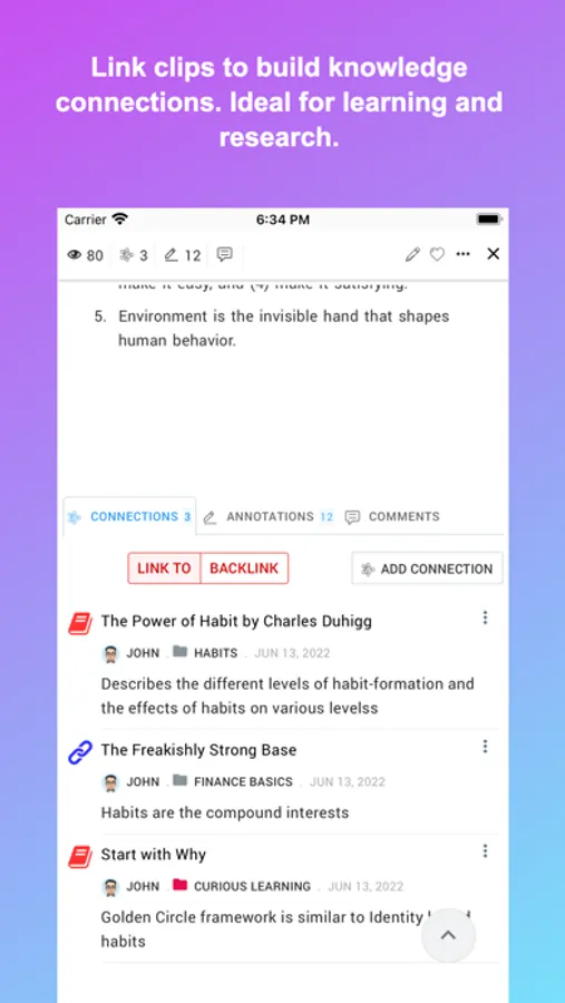 1. Save everything as clips - Collect articles, bookmarks, files, notes, annotations, and many other types of information. Academic learning materials, external learning sources, research articles, book notes, and topic annotations.
