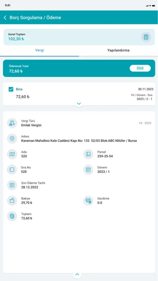 Ödeme İşlemleri Modülünde; Tüzel kişiler sicil no ve şifre girerek geçmişe yönelik olarak bütün borçları, borç türlerini, dönemi, borcunu ve gecikme zammını görebilmekte ve listedeki borç kalemlerini işaretleyerek istediklerinin ödemesini sanal pos vasıtasıyla kredi kartı bilgilerini girerek 2D veya 3D Secure seçenekleriyle güvenli bir şekilde gerçekleştirebilmektedir. Ödeme yapıldıktan sonra oluşan dekontu görüntüleyebilmekte ve e-posta ile istenilen adrese gönderilebilmektedir. Üye kaydı olmadan Hızlı Ödeme seçeneği ile vergi no veya TC Kimlik no girerek borç ödeme işlemi gerçekleştirilmektedir. Mükellefler isteği taktirde geçmiş dönem ödemelerini Sicil, TC Kimlik ya da Vergi No ile giriş yaparak listeleyebilmektedir.