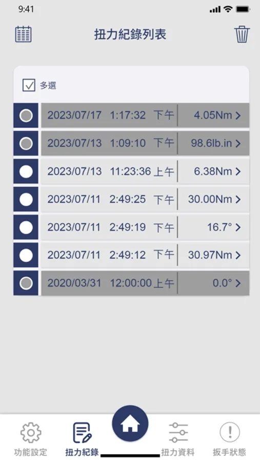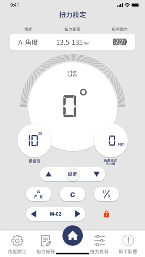 This APP allows you to connect a digital torque wrench via Bluetooth®, and display the torque data on the interface in real-time. It provides control functions such as sound, light signal, vibration, backlight, etc., and also has a lock button, memory function, and sleep time adjustment. The main display shows the current mode, torque range, power, torque value, etc. It also supports screw torque conversion and status warnings, including warnings of faults and overweight.