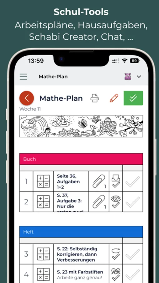 Schul-Tools: Schabi lässt dich den Schulalltag mit verschiedenen Tools einfach organisieren. Es gibt eine Hausaufgabenverwaltung, Arbeitspläne, Benutzerkonten-Manager, Listen und vieles mehr.