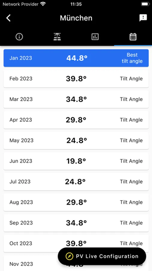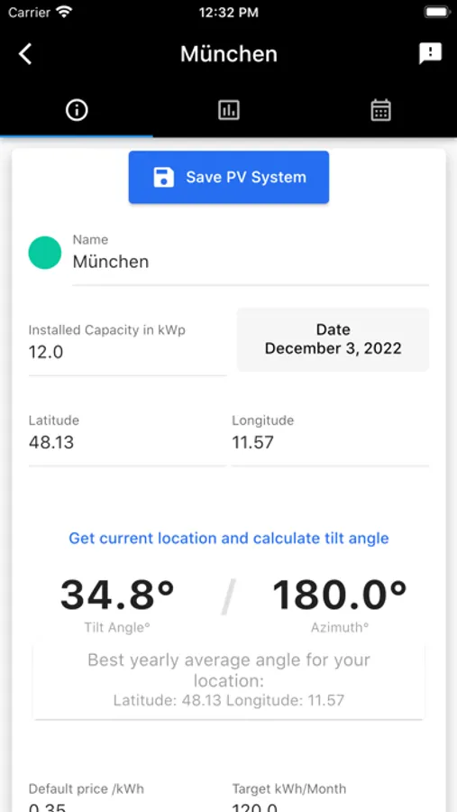 Calculate the optimum year-round and monthly tilt angle for your pv system in your location and get maximum electricity for your individual installations. Use your device to align your PV system to the calculated values. We show you the tilt and azimuth based on your real-time position and orientation.