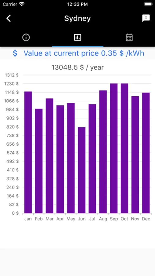 Yearly and monthly average values of photovoltaic electricity / power output by your PV system based on your installed capacity in kWp and your defined location.