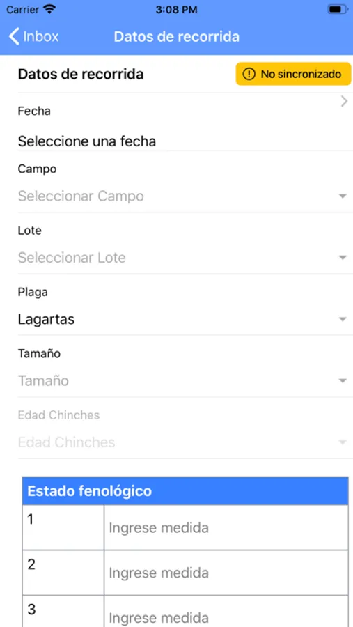 Permite ingresar datos como: campo, lote, tipo de plaga, tamaño, medidas y sanidad.