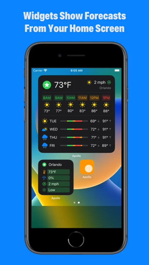 Apollo PREMIUM includes weather groups with multiple locations, home screen widgets, update ideal conditions and active times.