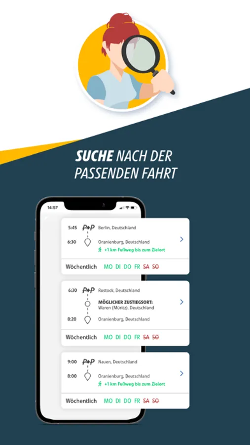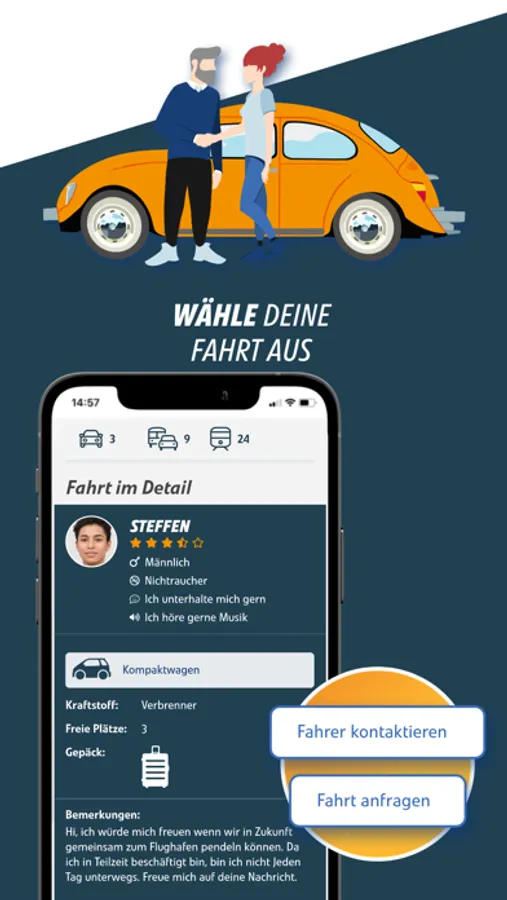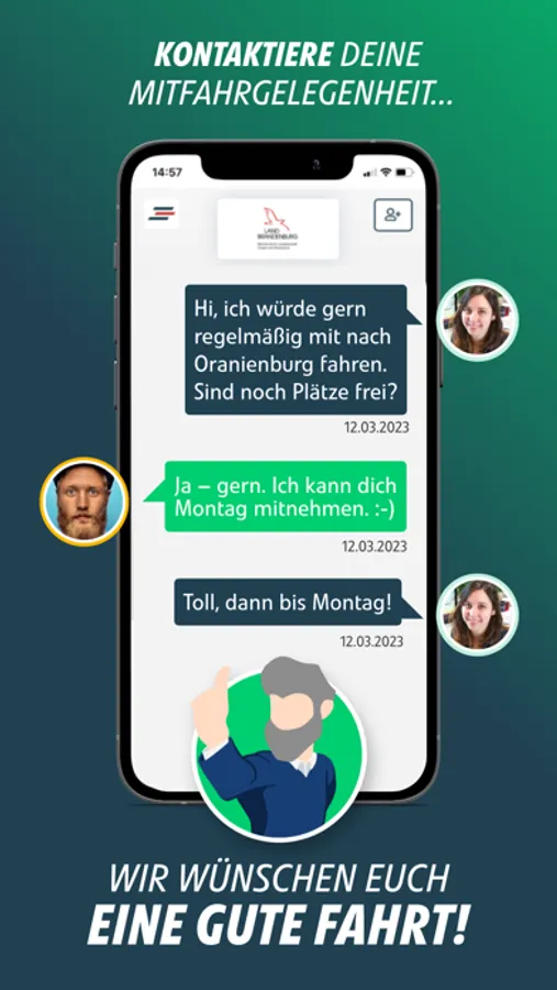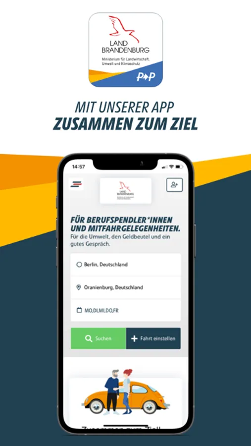 Du pendelst regelmäßig zur Arbeit oder suchst gelegentlich Mitfahrer*innen? Dann bist Du auf bei der MLUK mobile App richtig. Teilt Euch die Kosten, den Weg und ein gutes Gespräch - und entlastet dabei die Umwelt.