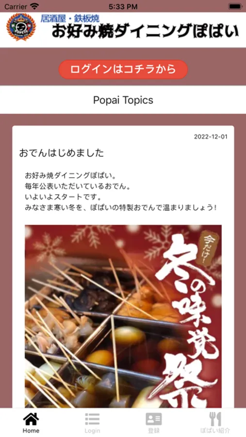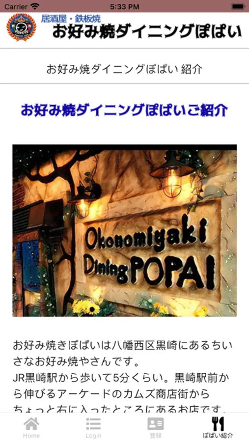 北九州市八幡西区、JR黒崎駅のすぐ近くにある、お好み焼ダイニングぽぱいの公式アプリです。いろんな最新情報を発信すると共に、登録していただきますとメンバーズカードとしてご利用いただくことが出来ます。ご来店・お食事をされる毎にポイントが貯まるサービスもあります。皆さま是非よろしくおねがいします!